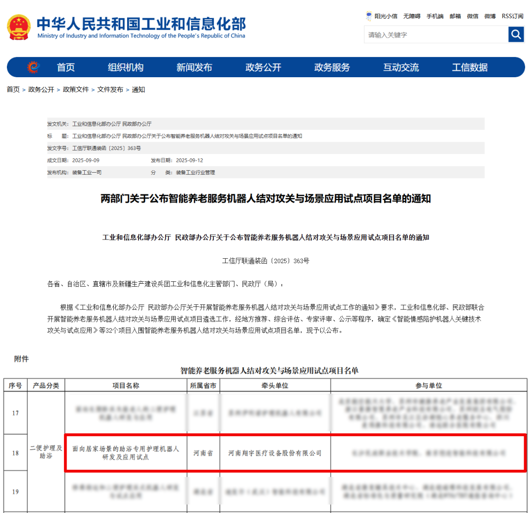 近日,工业和信息化部办公厅 民政部办公厅公布了《智能养老服务机器人结对攻关与场景应用试点项目名单》的通知。翔宇医疗牵头的“面向居家场景的助浴专用护理机器人研发及应用试点”项目是河南省唯一入选国家智能养老服务机器人结对攻关与场景应用试点的项目。
